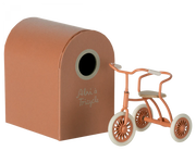 Our tricycles are made of metal and have wooden seats that are beautifully shaped. The bikes arrive in decorative boxes that can be used as bike sheds. Our mice friends with magnetic hands can hold onto the handlebars perfectly.