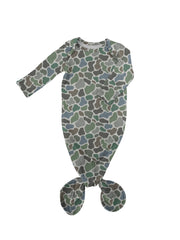 Knotted infant gown with foldable scratch mitts in 0-3 months.