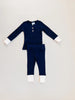 A comfy, soft henley shirt and pants set in a waffle knit fabric. Features extended arm and leg cuffs in cream.